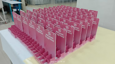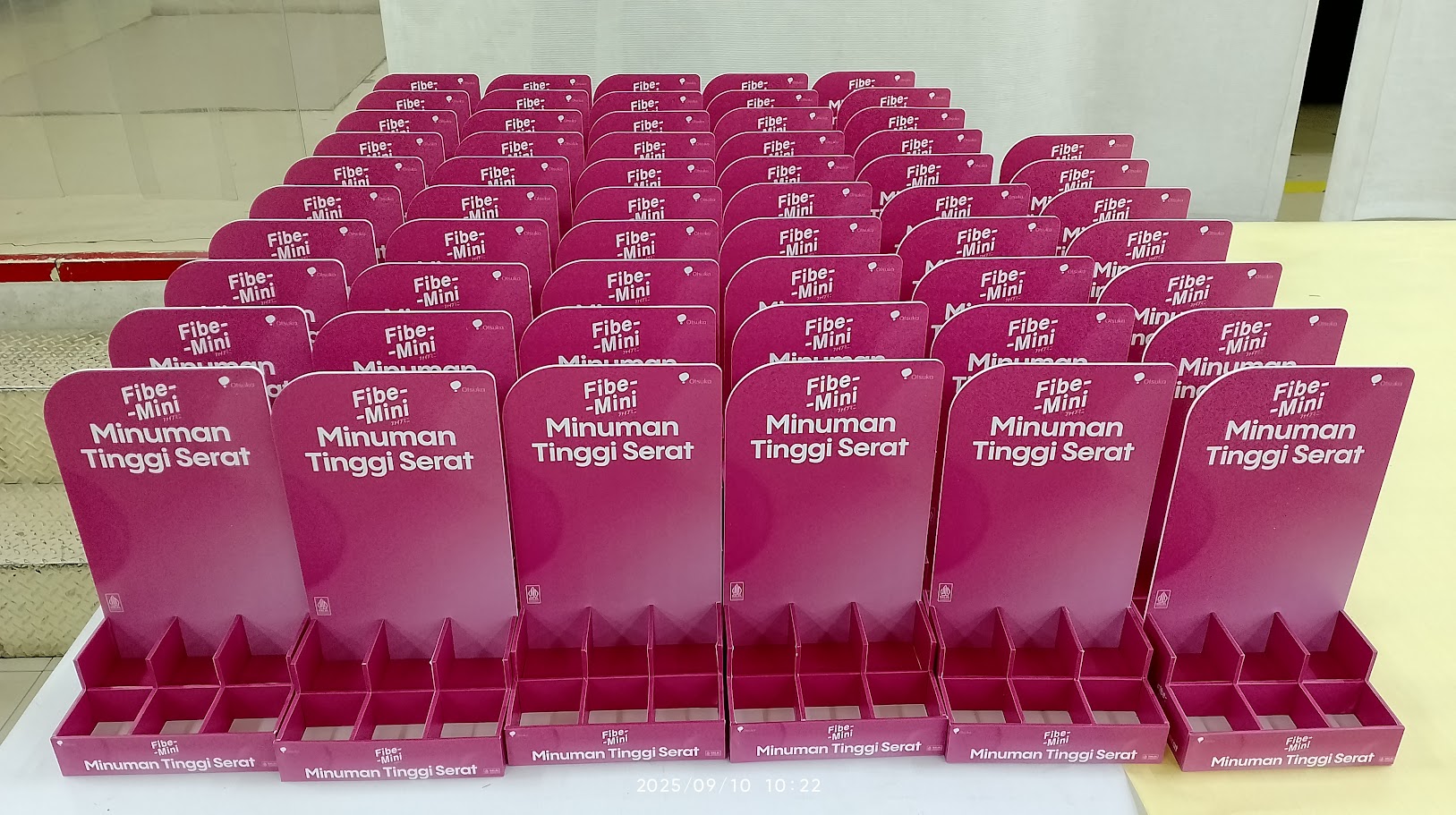 Untuk Corrugated Paper yang biasa kami gunakan untuk Top Table display, kami menggunakan corrugated paper E flute dengan ketebalan sekitar 1.5mm yang dilapis sticker dan di potong sesuai bentuk yang diinginkan.